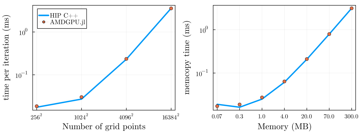 AMDGPU.jl makes it possible to program AMD GPUs at different abstraction levels: